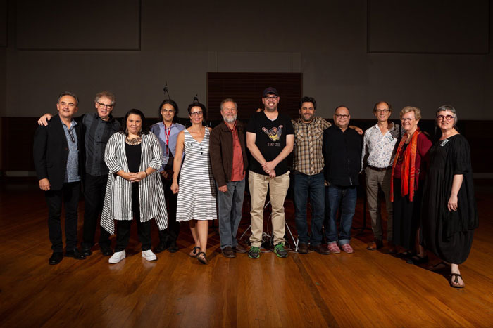 Participants of Ngarra-burria with industry partners. From left to right: John Davis, Stephen Adams, composer Nardi Simpson, Kim Cunio, Claire Edwards, Chris Sainsbury, composer Tim Gray, composer James Henry, composer Troy Russell, Roland Peelman, composer Elizabeth Sheppard, Lamorna Nightingale
